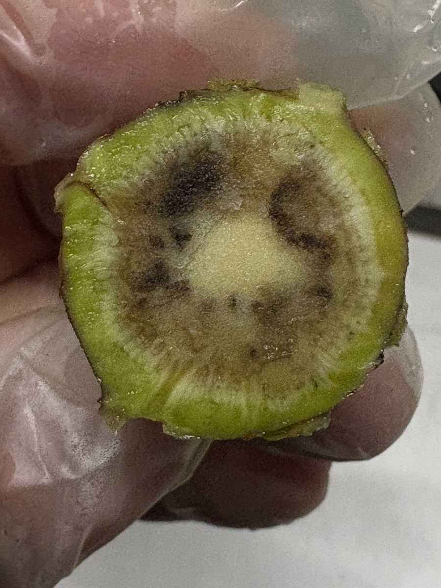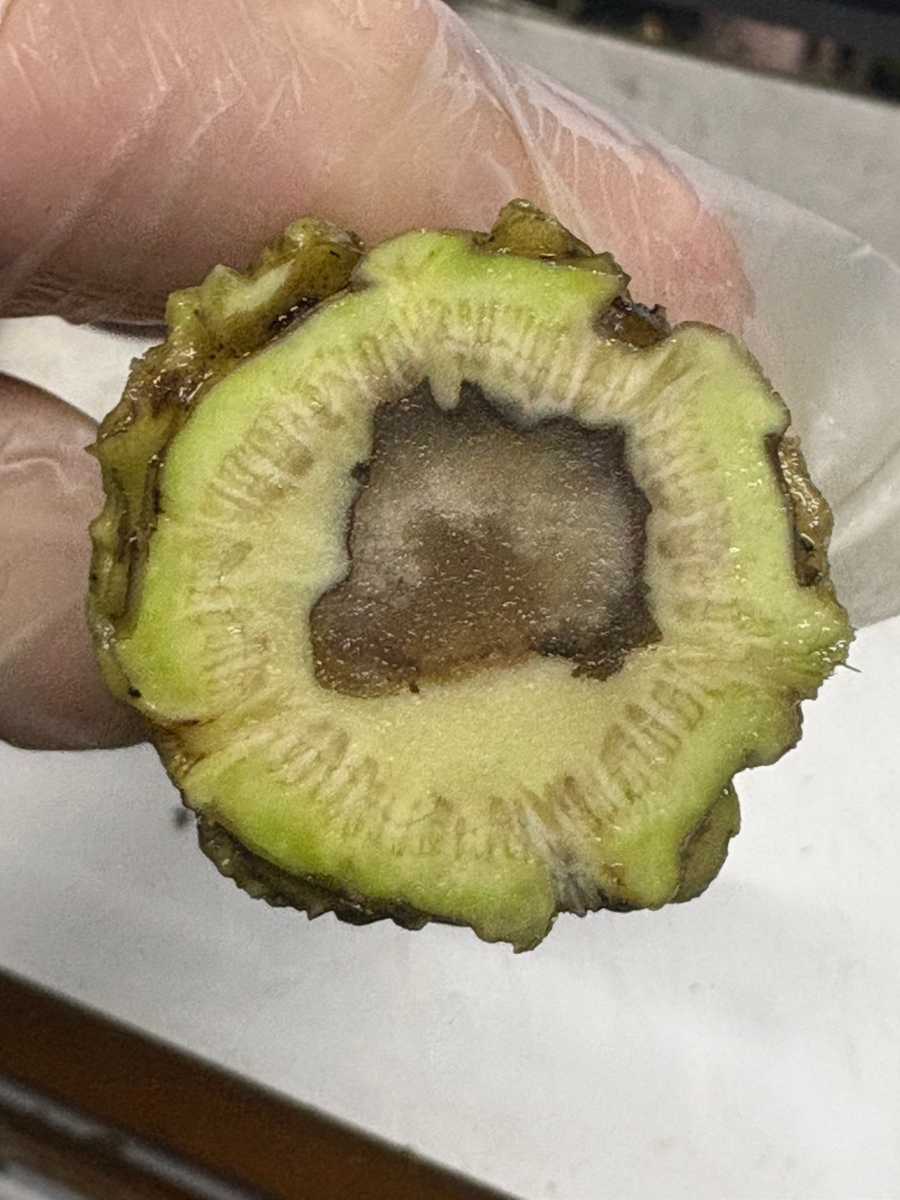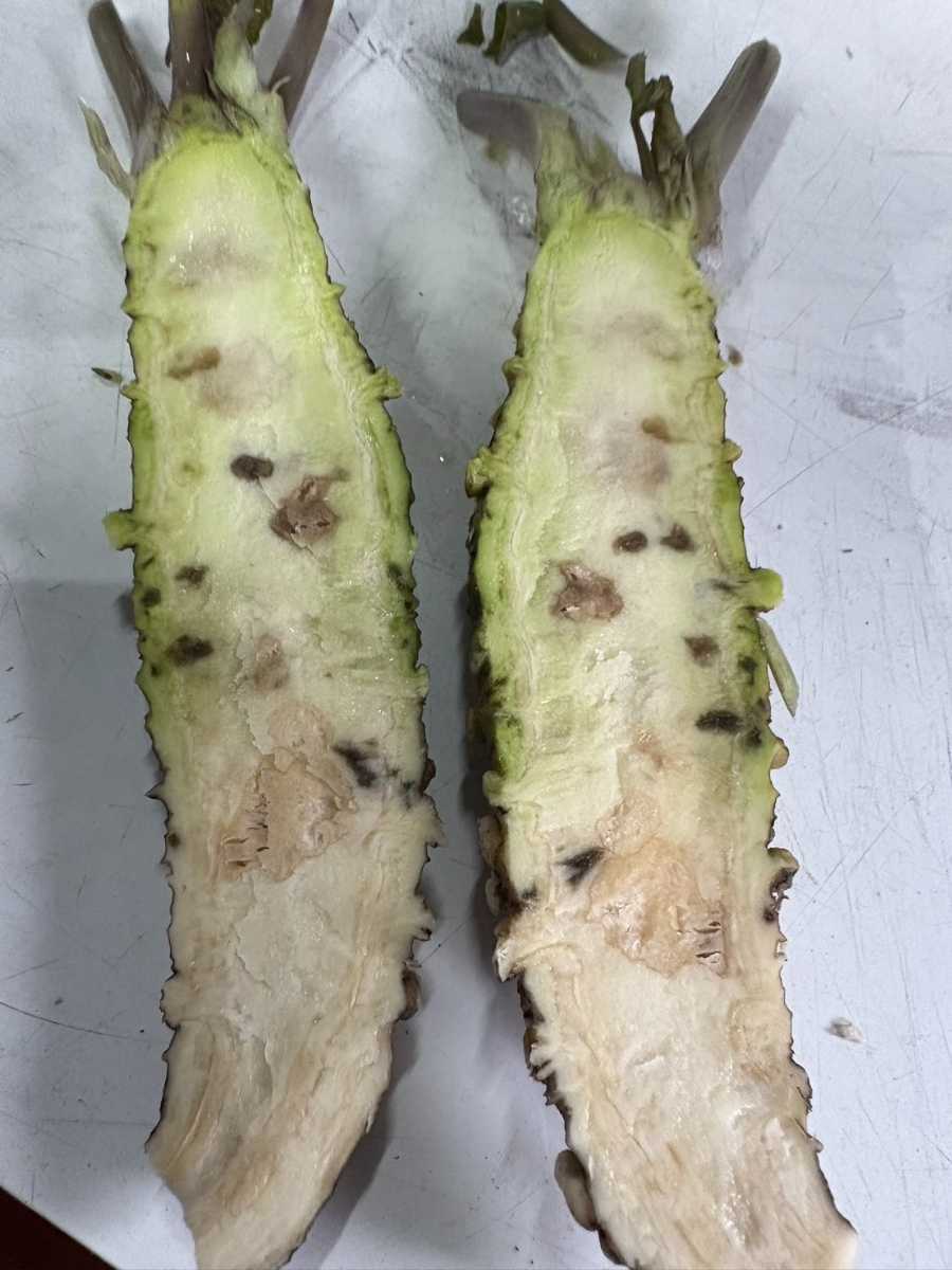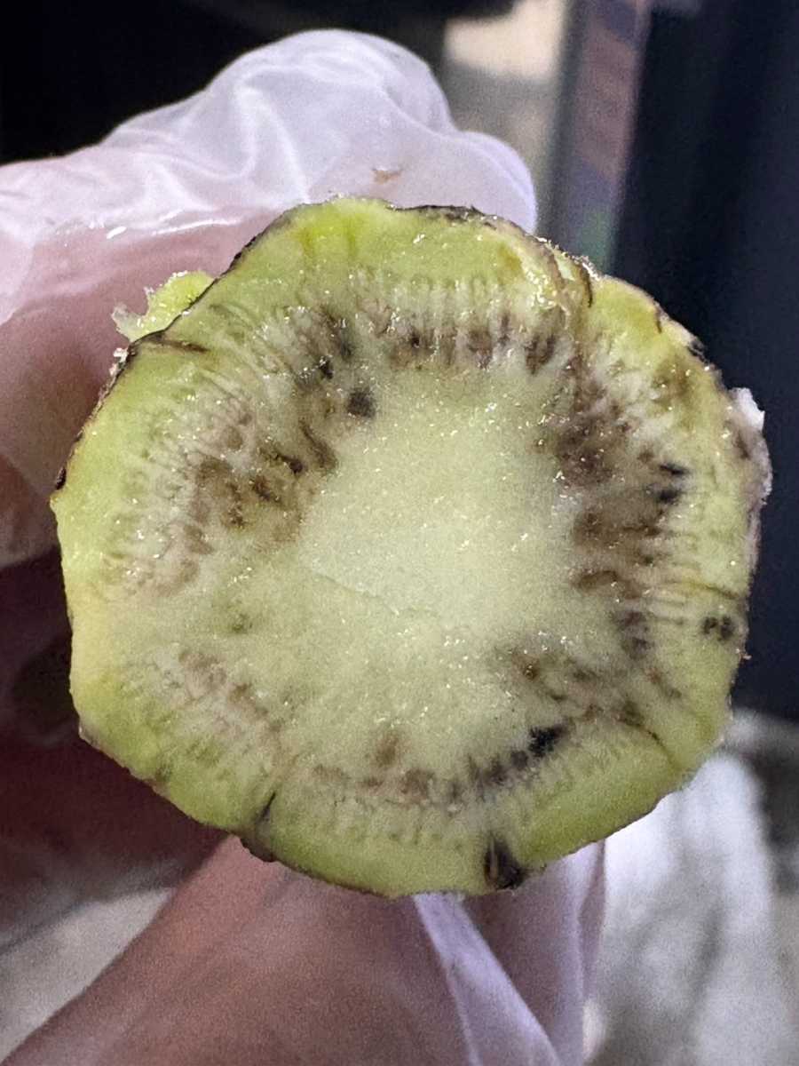 785本中438本がセンサー障害判定、内414本に実障害があった。日除けネットがなく、水回りもよくない沢。収穫時に3割くらい腐っていた。維管束の周りに墨や茶色の病変がとても多くあり、5割は障害判定になってしまった。廃棄は13Kgもあり、残念な週でした。