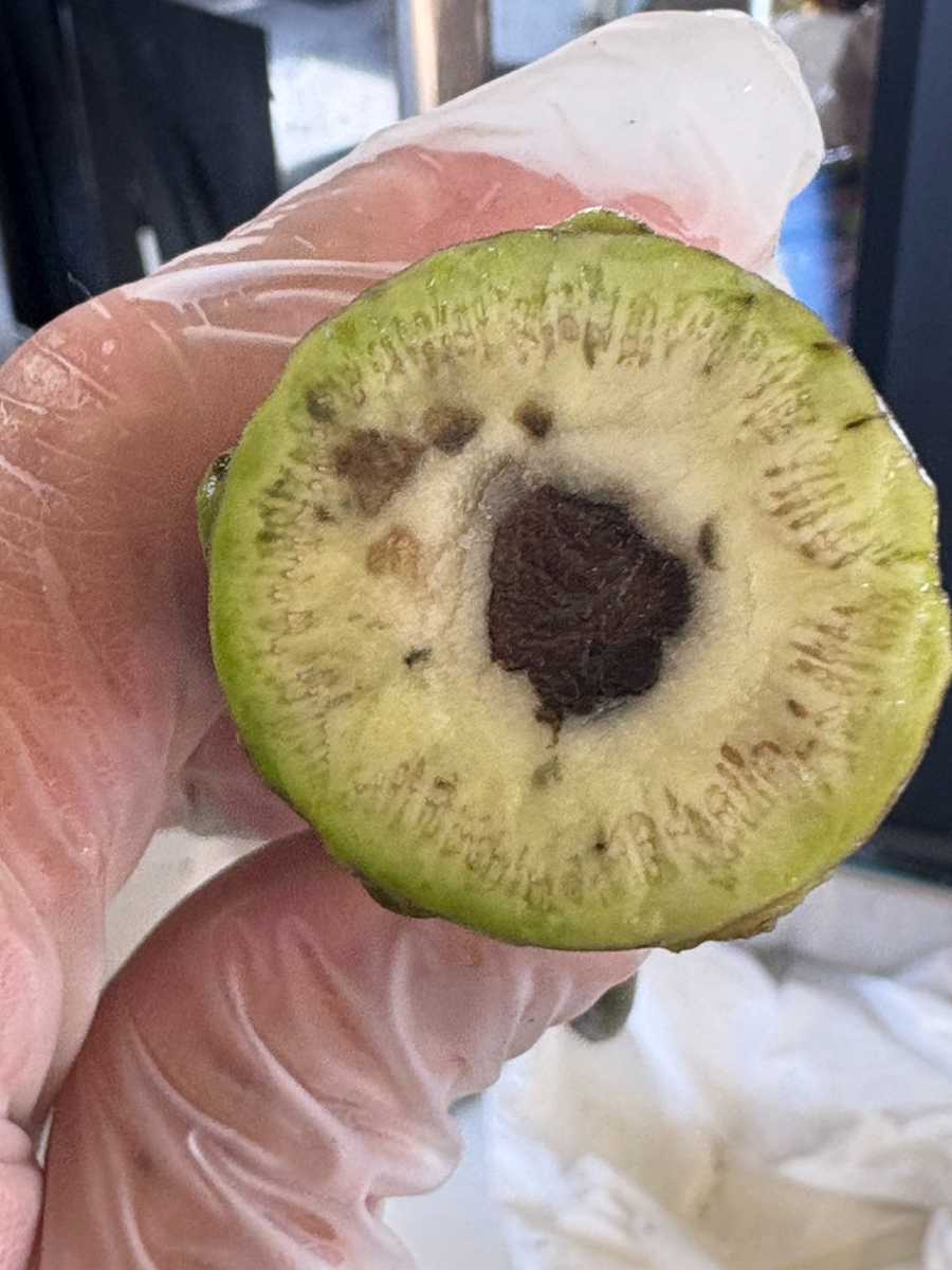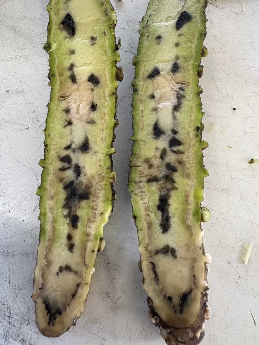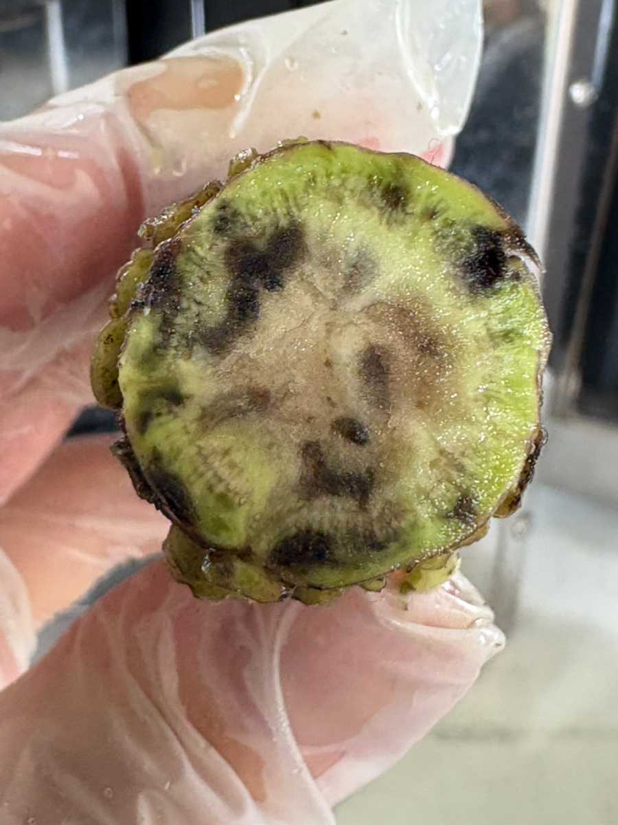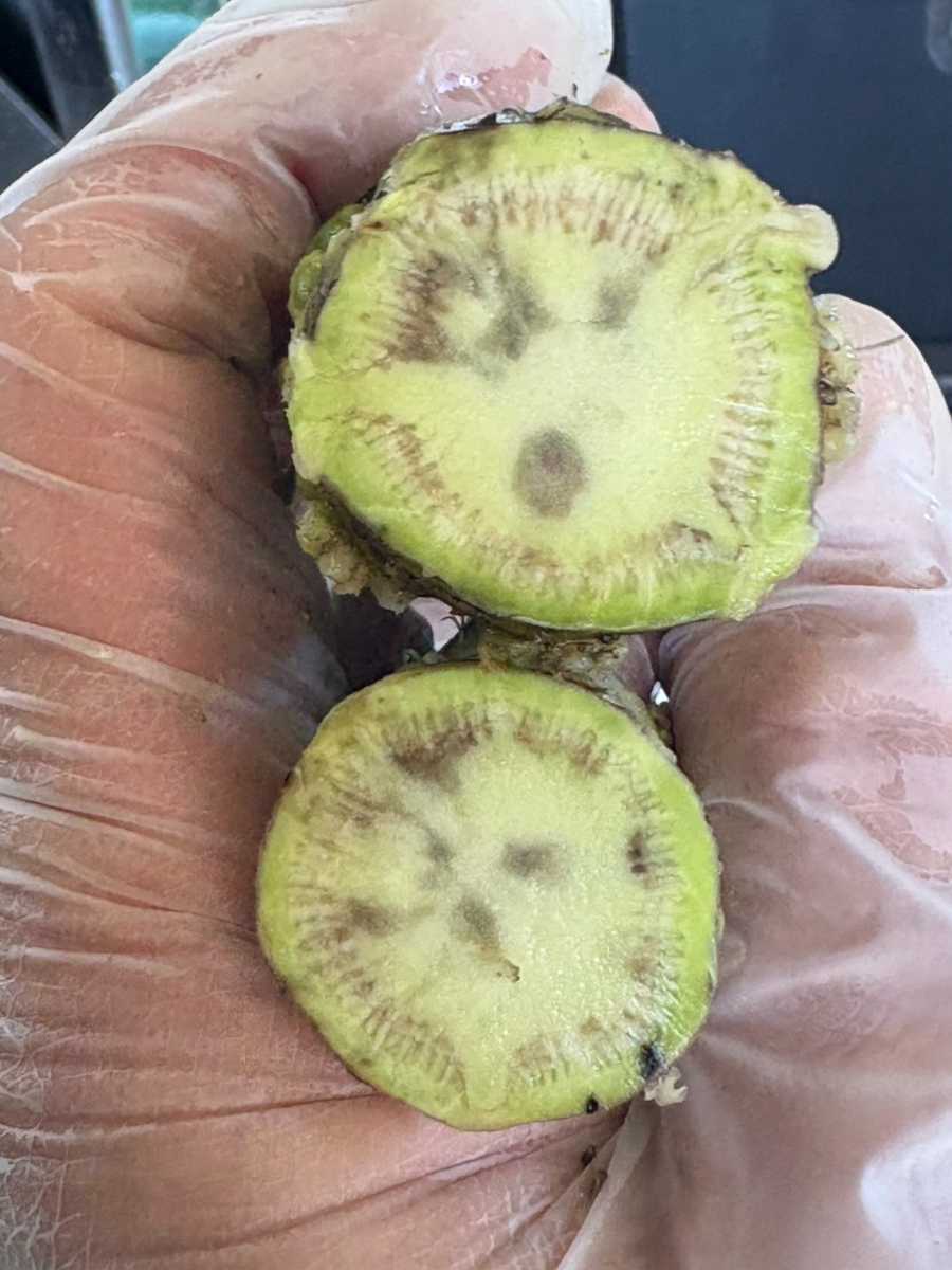 785本中438本がセンサー障害判定、内414本に実障害があった。日除けネットがなく、水回りもよくない沢。収穫時に3割くらい腐っていた。維管束の周りに墨や茶色の病変がとても多くあり、5割は障害判定になってしまった。廃棄は13Kgもあり、残念な週でした。
