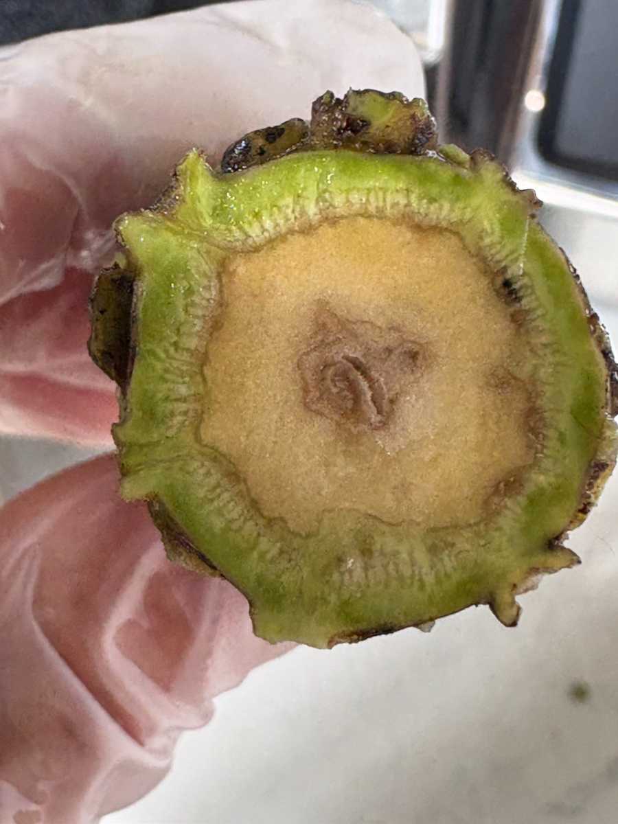 大きな墨、茶色の空洞、スポンジ状の内部障害が多く、定植20ヶ月だが、早いタイミングで内部障害が発生し、時間が経った感じだった。廃棄は4.5キロだった。
