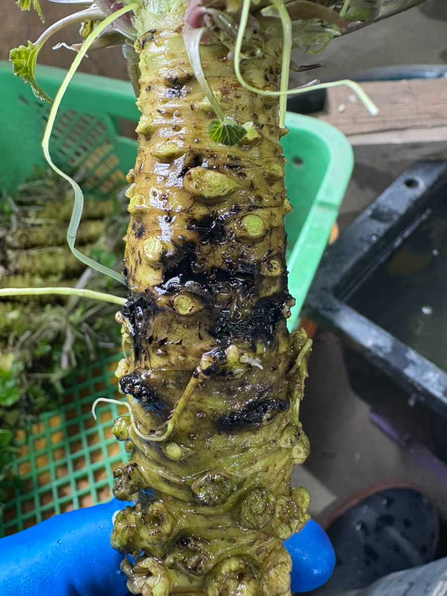 下の沢の方はさらに小さなサイズで、昨春の成長で太くなった後にやや細くなっているわさびがほとんどで、そこに維管束の墨色病変が多かった。その時期に一度弱ってしまったのかもしれない。