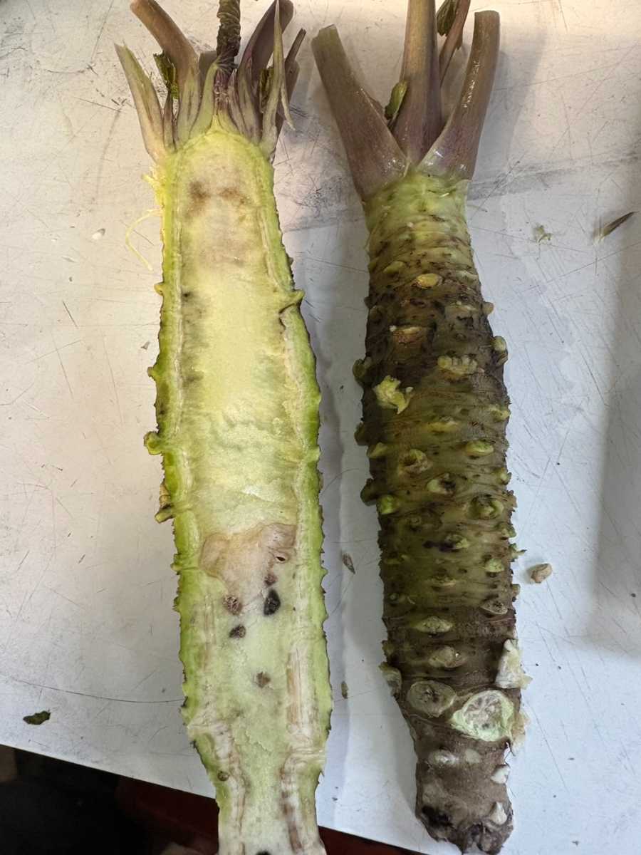 493本中43本がセンサー障害判定で、内38本に実障害があった。2割が前回の続きで、外観から解る腐り、キズが多かった。そして8割がウルトラ苗の1期目で腐りがかなり少なく綺麗だった。久しぶりに大きなわさびで外観と内部が良いわさびでした。廃棄は0.5キロでかなり少なかった。